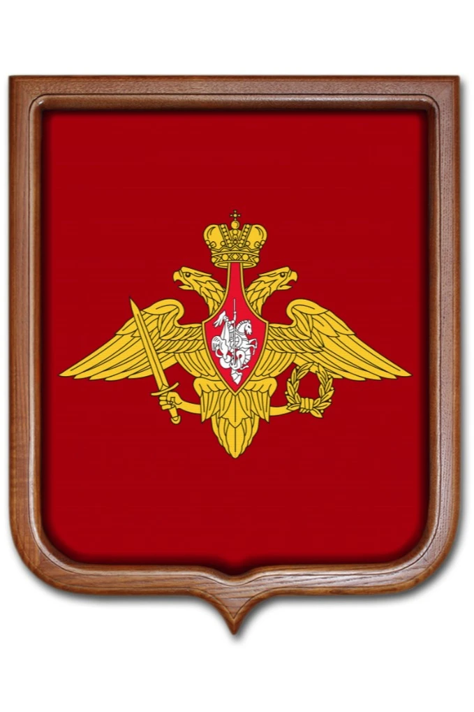 Герб Вооруженных Сил РФ - золотистого цвета двуглавый орел, изображенный с раскрытыми крыльями. В левой лапе у него находится лавровый венок, а в правой - меч. Грудь величественной птицы украшена алым треугольным щитом с тонкой золотой окантовкой. На нем в серебряном цвете изображен Георгий Победоносец, поражающий дракона. Увенчан щит золотой короной с крестом.