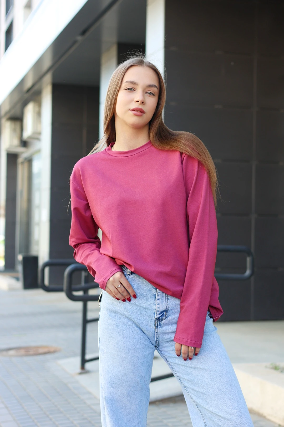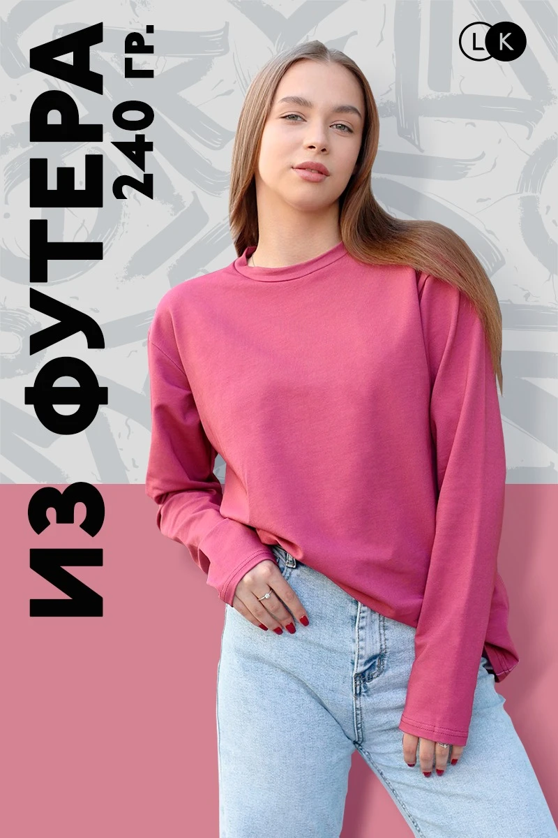 Модель. Лонгслив прямого силуэта с длинным рукавом. Имеет O-образный ворот. Горловина обрабатывается планкой из основной ткани. Обработка среза горловины спинки: киперной лентой серого цвета.