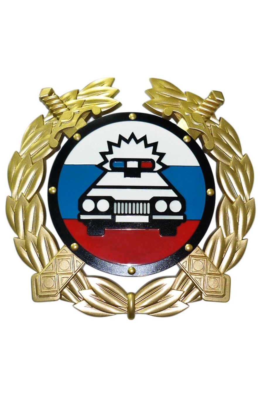 Герб ГИБДД РФ представлен нам в виде эмблемы круглой формы, окантованной тонкой черной полосой с восемью золотыми вкраплениями. Эмблема раскрашена в цвета российского флага. На ней находится стилизованное изображение патрульного автомобиля. Под эмблемой расположились два сложенных диагональным крестом золотых меча. В качестве обрамления использованы золотистые ветви лаврового венка.