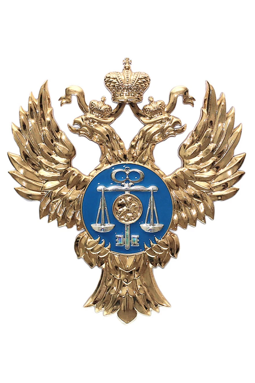 Герб Казначейства РФ - золотистый двуглавый орел, на каждой голове которого находится золотая корона. Дополнительная корона расположена посередине. Грудь величественной птицы украшает синий щиток, который орел держит своими когтями. На щитке вертикально расположился серебристый ключ и того же цвета весы. Поверх всего - золотая эмблема с Георгием Победоносцем.