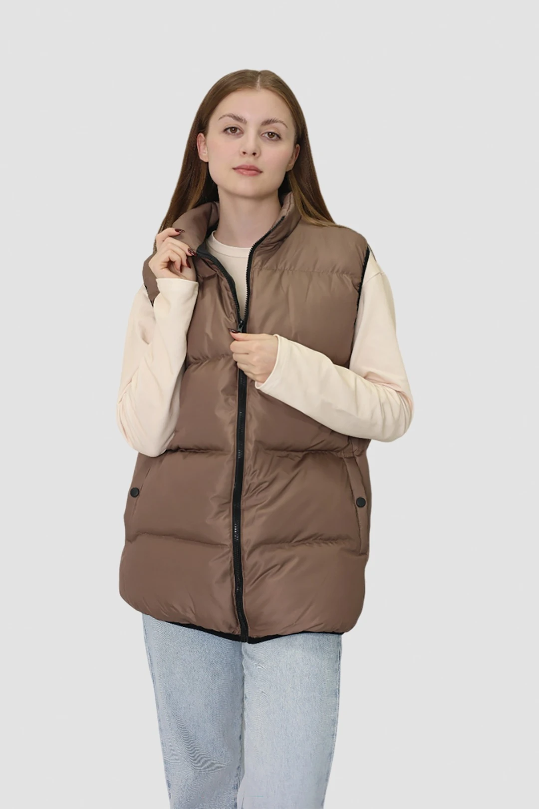 Модель: Жилет Дейтон прямого силуэта утепленный синтепух 100 гр., с подкладом из шелка черного цвета. Стежка по спинке и полочке, Воротник стойка, застежка молния тракторная черного цвета. Имеет два кармана в боковом шве с листочкой на кнопке. Боковой шов смещен вперед.