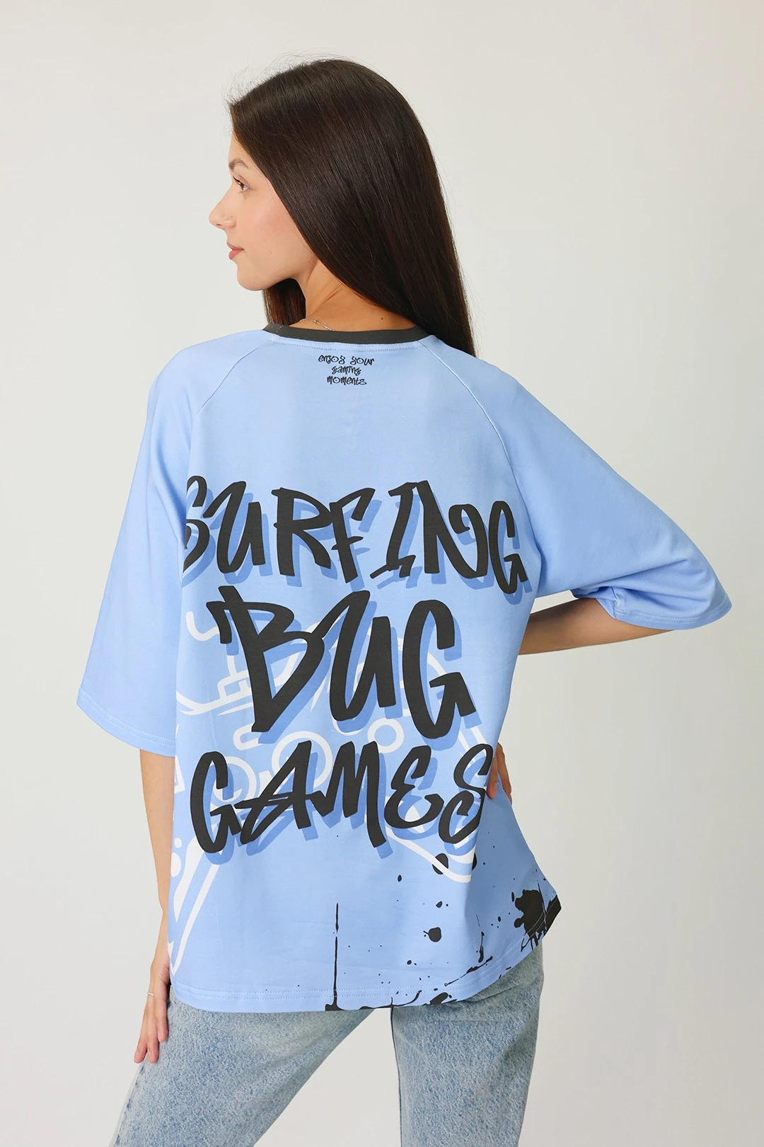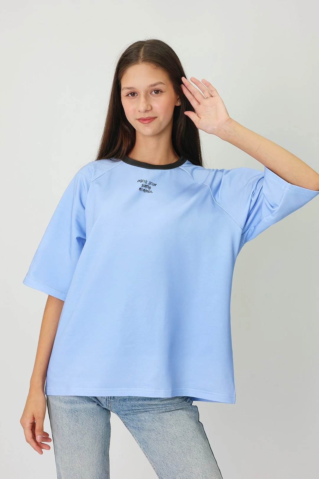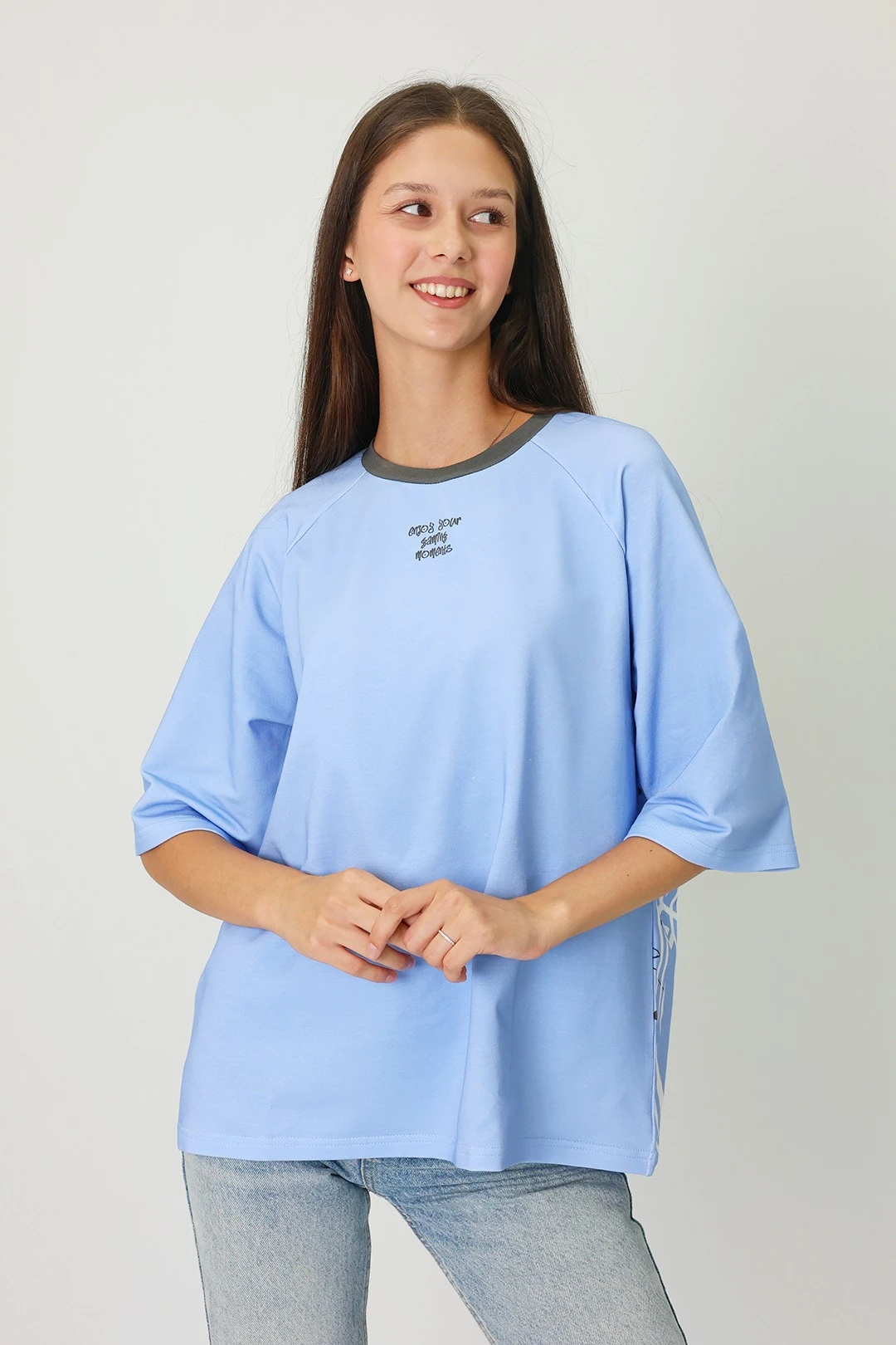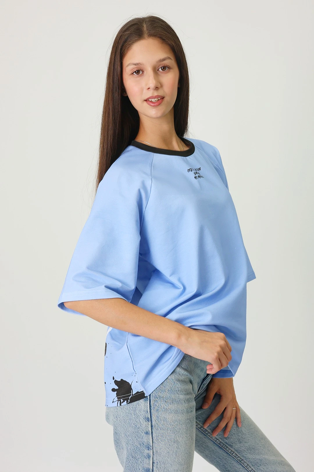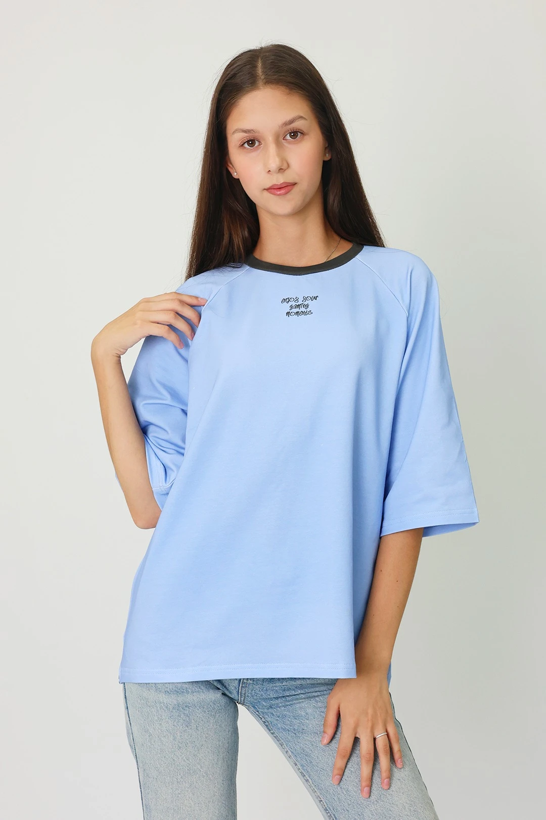 Модель. Футболка оверсайз с рукавом реглан. В модели из кулирной глади горловина обрабатывается руликом, из футера планкой из основной ткани. Низ изделия и рукава обрабатываются на плоскошовной машине. Форма ворота О-образная