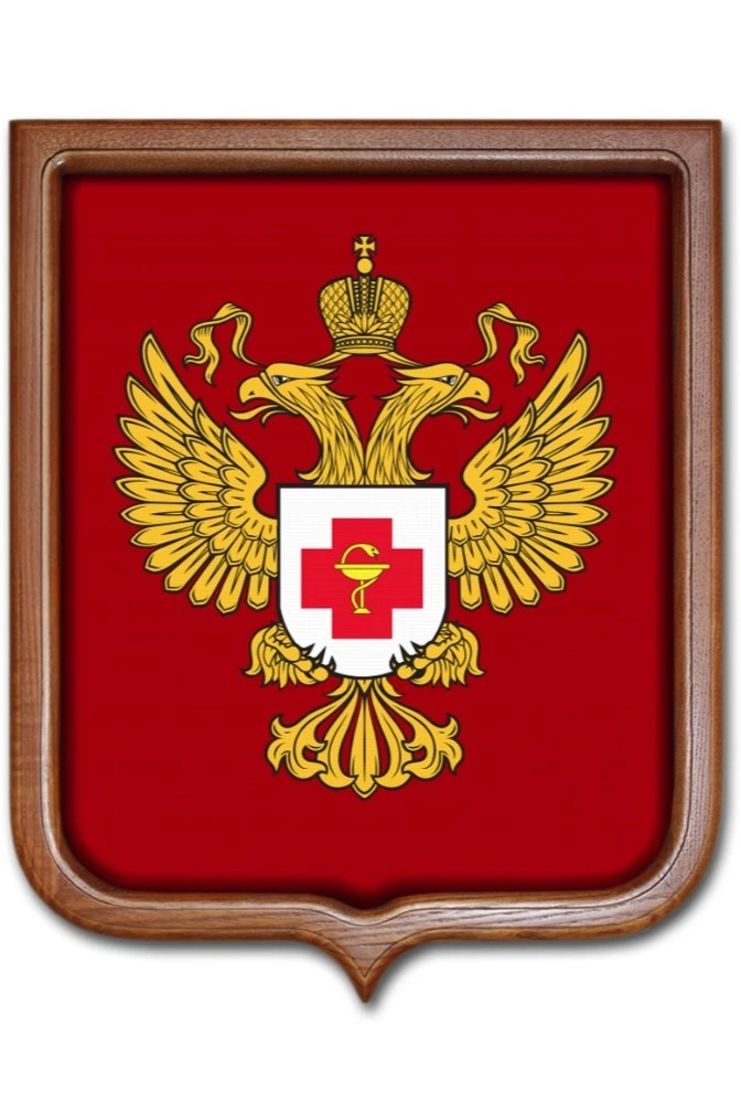 Герб Минздравсоцразвития РФ представлен нам в виде золотого двуглавого орла, изображенного с раскрытыми крыльями и высунутыми языками. Головы увенчаны золотого цвета коронами. Непосредственно над орлом - еще одна корона, большего размера. На груди у птицы расположился белый геральдический щит. Орел удерживает его когтями. На щите - медицинский алый крест, на котором находится золотая змея и чаша.