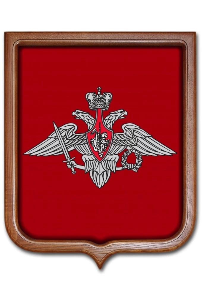 Герб Министерства Обороны РФ представлен зрителям в виде серебристого двуглавого орла, изображенного с раскрытыми крыльями и обращенными в разные стороны головами. В когтях орел удерживает меч и лавровый венок. Грудь птицы украшена алым треугольным щитом с тонкой серебряной полосой окантовки. На нем изображен Георгий Победоносец, пронзающий дракона. Щит увенчан серебристой короной.