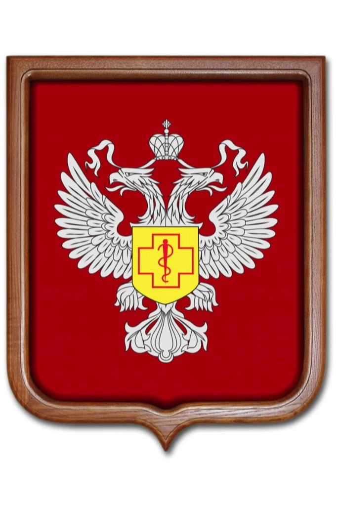 Герб Роспотребнадзора представлен зрителям как золотого цвета двуглавый орел. Головы его повернуты в разные стороны, языки высунуты. Над орлом - золотистая корона, от которой расходится к орлиным головам того же цвета лента. В когтях у птицы зажат геральдический щит с закругленным окончанием. На его желтом фоне изображен алый медицинский крест. Фон креста также желтый. Внутри него - красный посох Асклепия, обвитый змеем.