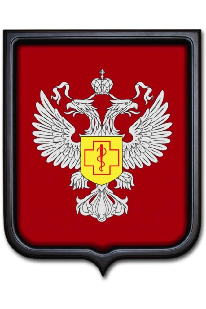 Герб Роспотребнадзора представлен зрителям как золотого цвета двуглавый орел. Головы его повернуты в разные стороны, языки высунуты. Над орлом - золотистая корона, от которой расходится к орлиным головам того же цвета лента. В когтях у птицы зажат геральдический щит с закругленным окончанием. На его желтом фоне изображен алый медицинский крест. Фон креста также желтый. Внутри него - красный посох Асклепия, обвитый змеем.