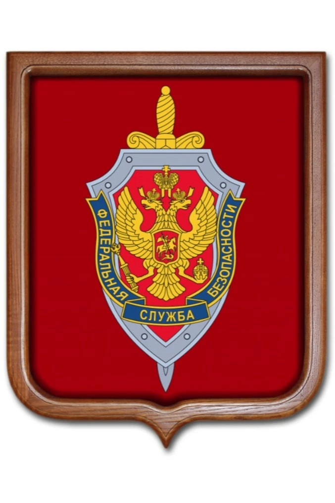 Герб ФСБ РФ представляет собой рыцарский фигурный щит с широкой серебряной полосой окантовки, расположенный поверх золотого меча. Вдоль окантовки щита проходит синяя лента с тиснеными на ней золотыми буквами, составляющими слова «Федеральная Служба Безопасности». На алом фоне щита изображен двуглавый золотистый орел, увенчанный тремя коронами. Он сжимает в когтях державу и скипетр. На груди у птицы можно заметить московский герб.