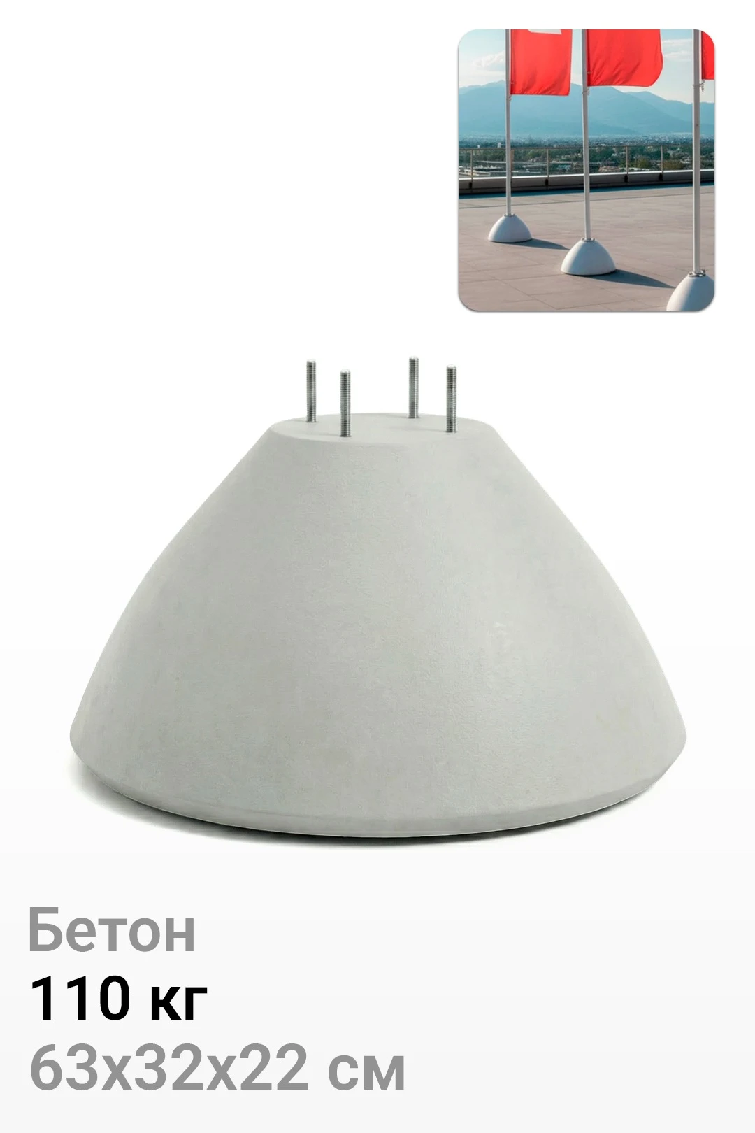 Бетонное основание "Сфера" предназначено для установки флагштоков Моби и Меркурий без плеча высотой до 6 м на ровной поверхности. Основание выполнено из прочного бетона, что обеспечивает устойчивость и надежность конструкции при любых погодных условиях. Такой вариант идеально подойдёт для временных и стационарных установок флагов в торговых точках и на мероприятиях.