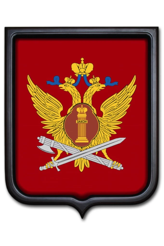 Герб ФСИН РФ - это золоченый орел с двумя головами, каждую из которых украшает корона. Над величественной птицей расположена третья корона, соединенная с остальными синей фигурной лентой. В орлиных когтях зажаты сложенные крест-накрест серебристые меч и топор. Грудь птицы украшена округлым щитком алого цвета. Внутри него - золотая колонна с надписью «ЗАКОН», увенчанная короной.