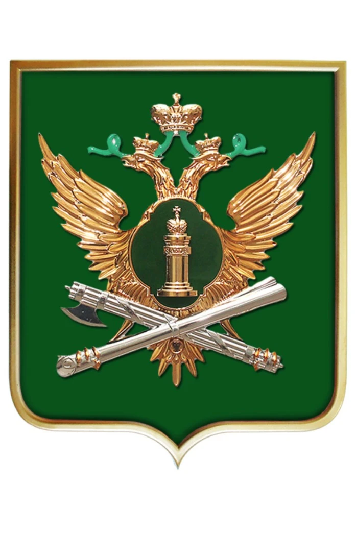 Герб ФССП РФ представляет собой изображение золотистого двуглавого орла с распахнутыми крыльями. Каждую голову украшает корона, а над орлом находится еще одна корона размером побольше. В когтях птица удерживает скрещенные ружейное дуло и топор в серебряном цвете. На груди у орла находится округлый фигурный щиток с изумрудным фоном. На нем изображена золотая колонна с короной.