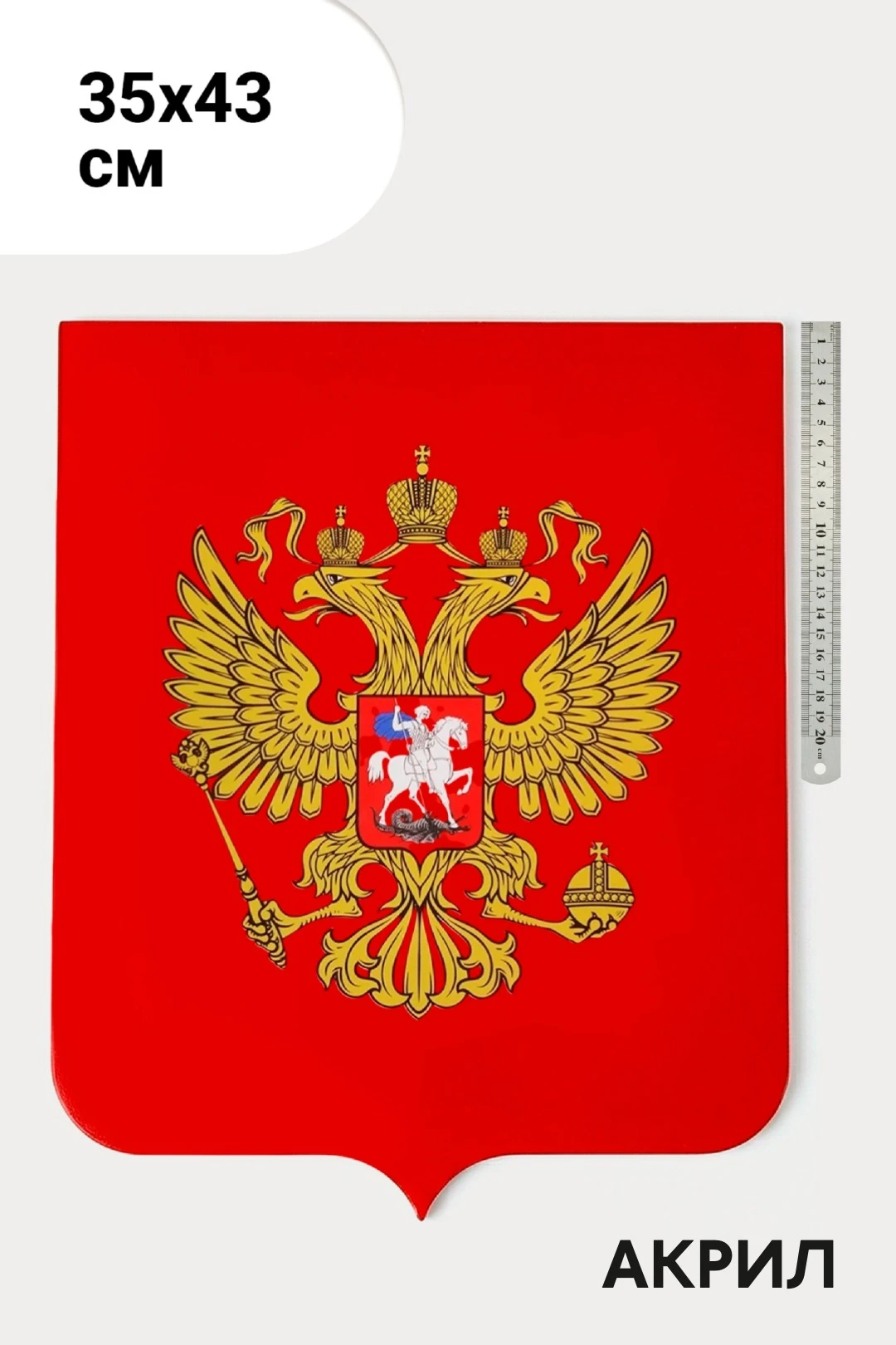 Гербы России на щите из акрила - самый доступный вариант. Такие гербы прекрасно вписываются в кабинеты самых разных форматов: актовые залы, залы суда, кабинеты чиновников и руководителей любых уровней.
