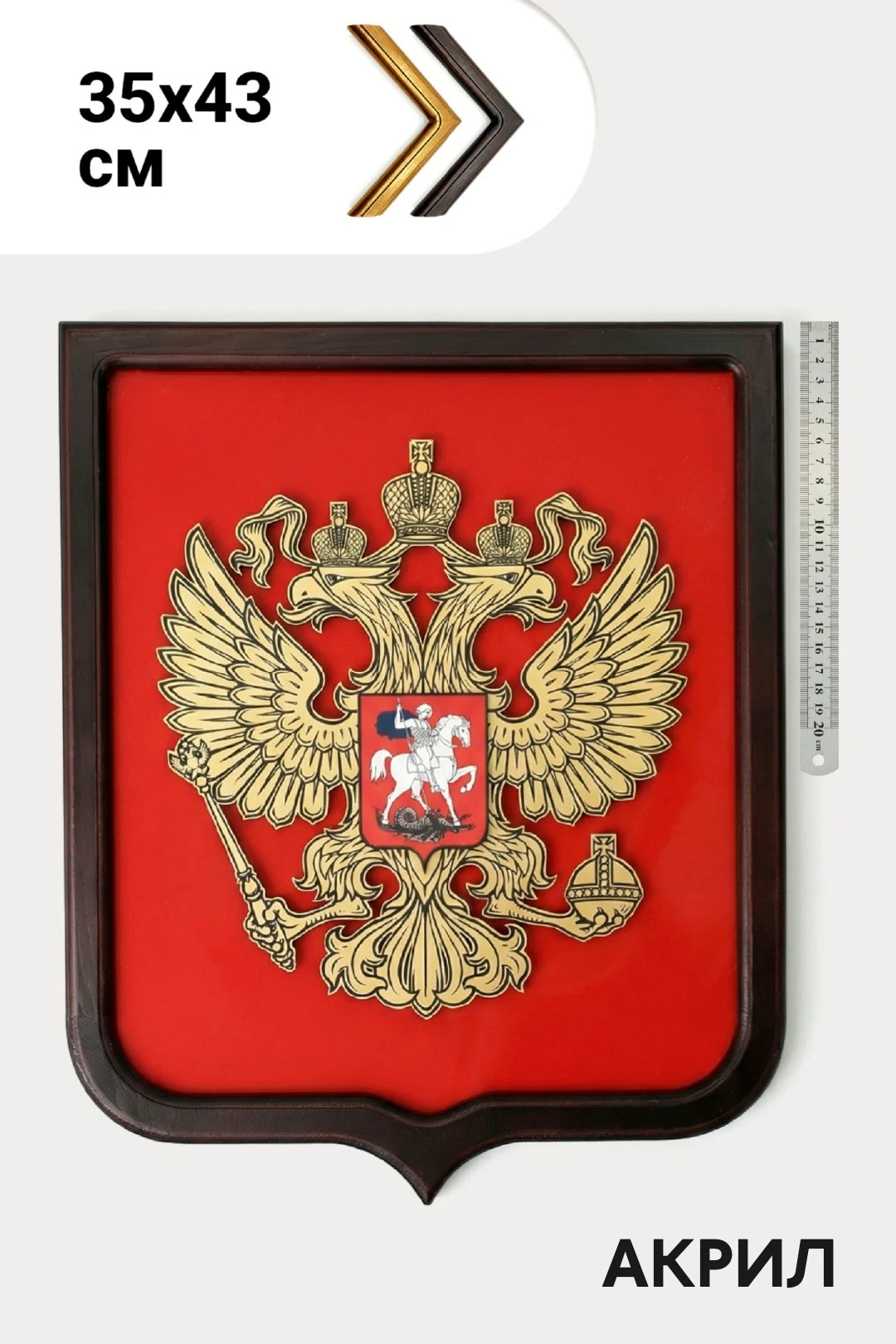 Рельефный герб из пластика с нанесением УФ печати закреплен на основе из акрила. Объём создаётся за счёт подложки из фоамирана, которая приподнимает герб над поверхностью. Изделие обрамлено в деревянную рамку — это придаёт законченный вид и подчёркивает эстетику решения.
