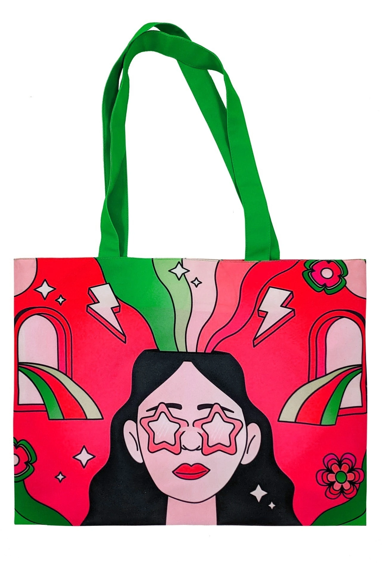 Печать с двух сторон: полноцветная печать осуществляется с двух сторон по всей поверхности сумки, ручки сумки запечатываются фоновой заливкой без элементов дизайна.