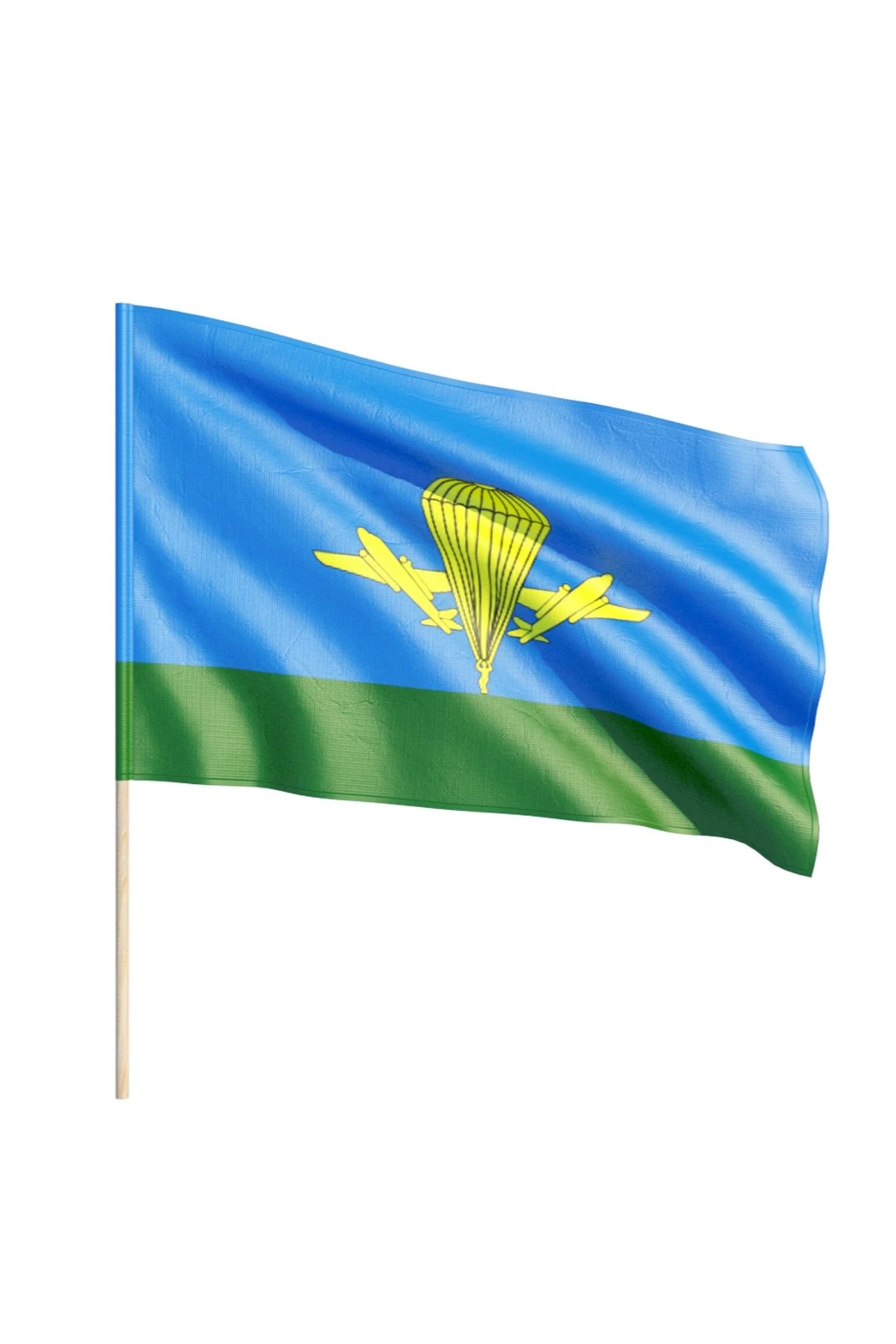 Описание. Флаг представляет собой прямоугольное двухстороннее полотнище голубого цвета (небо) с зелёной полосой в нижней части (земля). В центре полотнища - изображение золотого раскрытого парашюта с фигурой парашютиста и двух самолётов с обеих сторон парашюта. Отношение ширины флага к его длине 2:3. Отношение ширины изображения к длине флага и высоты изображения к ширине флага 1:2. Отношение ширины зелёной полосы к ширине флага 1:4. Используется сухопутными войсками.