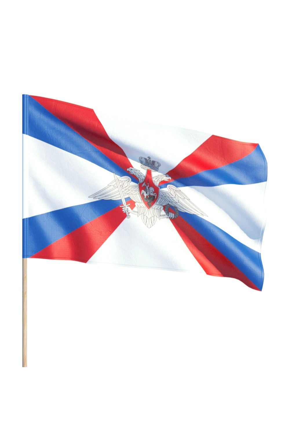 Флаг Министерства обороны РФ представляет собой полотно из полиэфирной ткани с нанесенным на нее изображением официальной символики. Рисунок флага выполнен в виде белого креста с четырьмя расширяющимися к краям лучами, между которыми расположены более тонкие полоски синего и красного цвета. Сочетания этих полос образуют государственный флаг Российской Федерации.