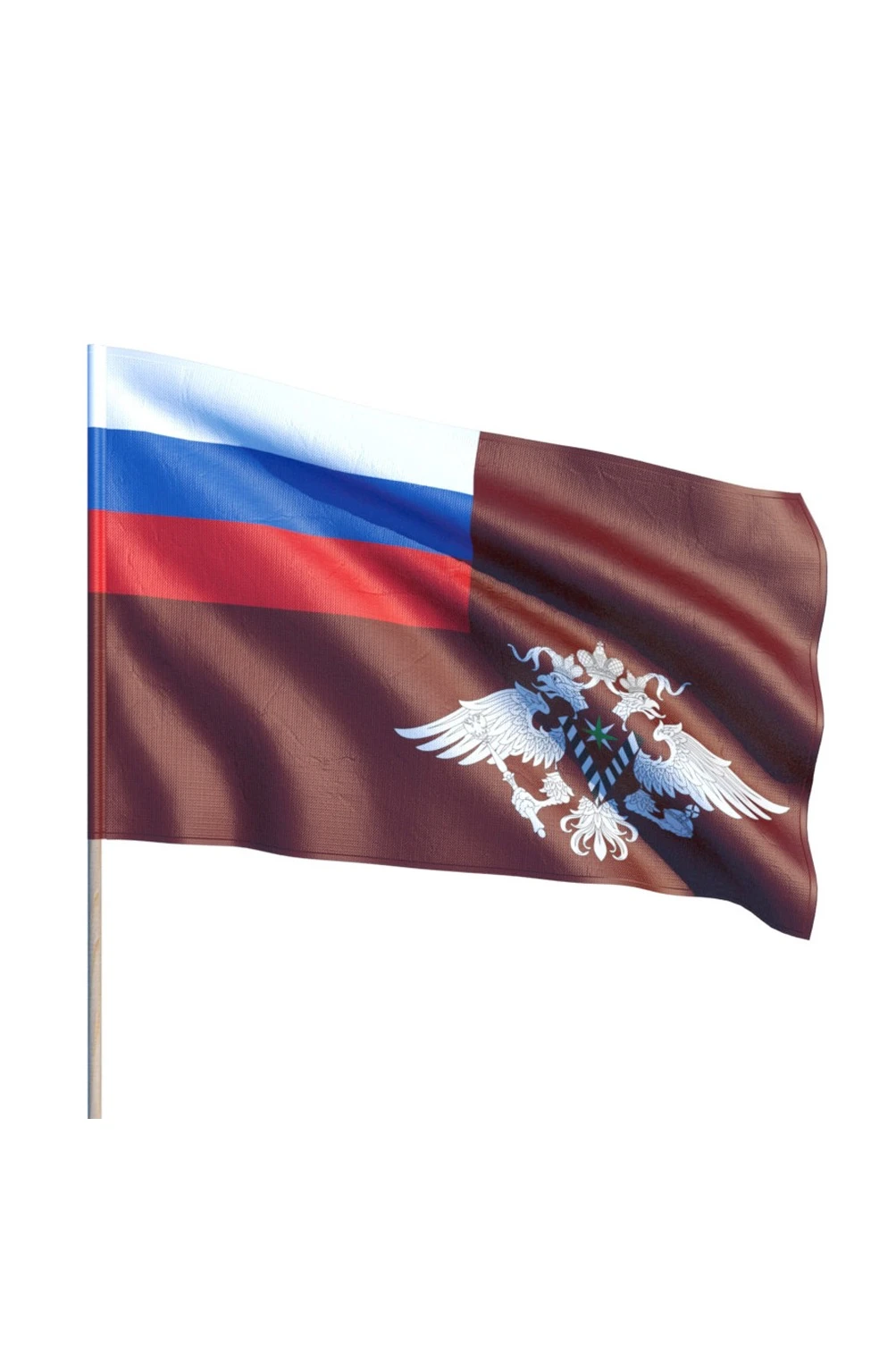 История и символика. Флаг Федеральной миграционной службы – это полотно прямоугольной формы. Цвет полотна – бордовый. В крыже (верхнем углу у древка) нанесено изображение российского государственного флага. Правая половина флага, ее нижний угол, содержит геральдическую эмблему Федеральной миграционной службы. Ширина полотна относится к длине как один к полутора. Крыж с российским триколором занимает одну четвертую полотнища. Высота эмблемы по отношению к ширине флага составляет одну вторую, ширина – пять девятых от длины флага. Расстояние от знака-эмблемы до нижнего и правого краев флага составляет одну двадцатую общей ширины флага.
