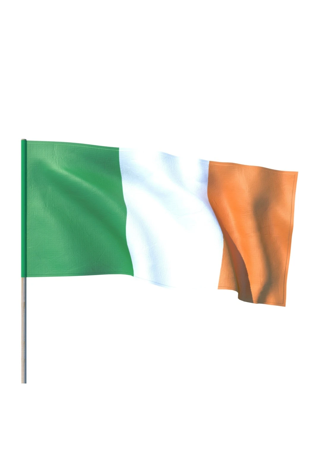 Флаг Ирландии имеет форму прямоугольного полотна, ширина которого вдвое меньше длины. Вся его поверхность поделена вертикально на три абсолютно равные по размеру, но неодинаковые по цвету части. Та из них, что непосредственно примыкает к древку, является зеленой. Противоположная часть окрашена в оранжевый цвет. Та же, что располагается между ними, полностью белая. Зеленый и оранжевый цвета в данном контексте олицетворяют собой католиков и протестантов соответственно. Белый же цвет говорит о мире между этими последователями религиозных течений христианства.