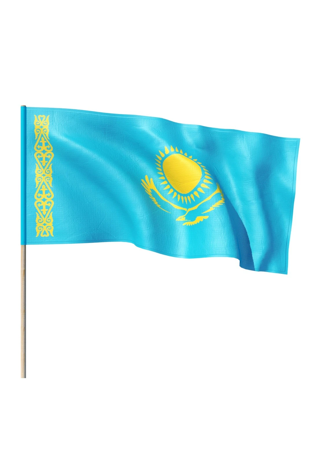 Описание. Государственный флаг Республики Казахстан представляет собой прямоугольное полотнище голубого цвета с изображением в его центре солнца с 32 лучами, под которым - парящий орел. У древка - вертикальная полоса с национальным орнаментом. Изображение солнца с лучами, орла и вертикальной полосы с национальным орнаментом - цвета золота. Соотношение ширины флага к его длине 1:2. Флаги символ свободы, независимости и суверенитета Республики Казахстан. Одноцветие фона - символ единства Казахстана.