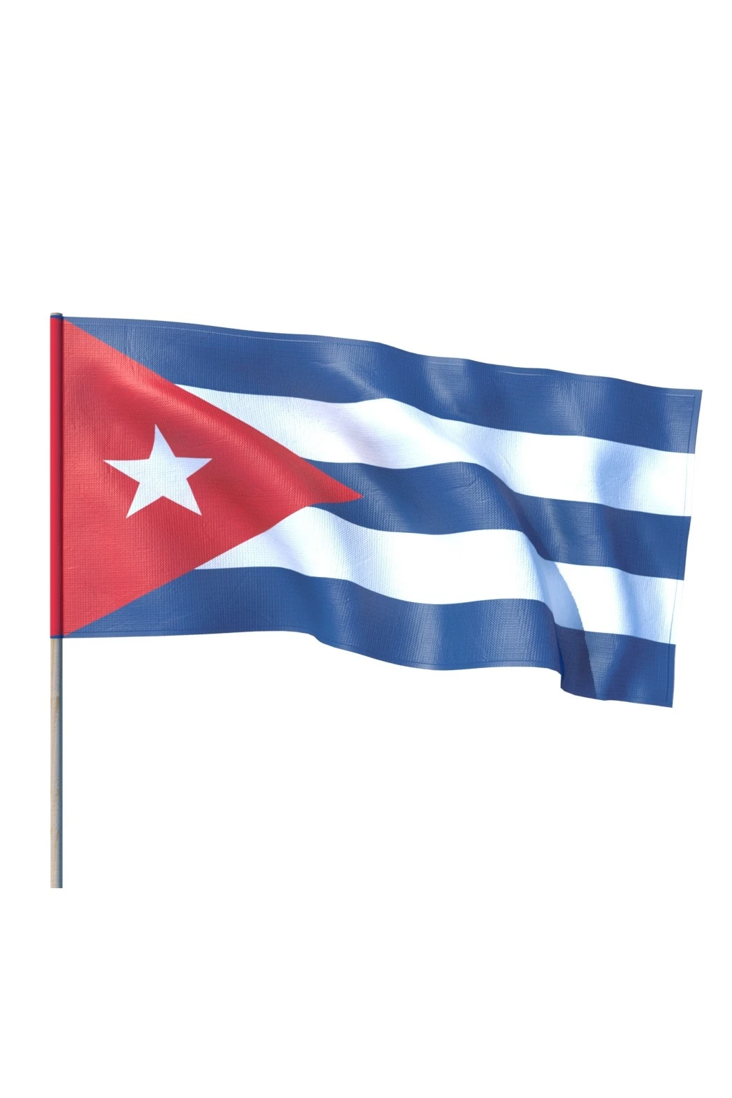 Флаг Кубы выполнен в форме прямоугольного полотна, длина которого в два раза превышает ширину. Его поверхность по горизонтали разделена пятью полосами равного размера. Они различаются лишь по цвету. Верхняя, нижняя и центральная полосы являются синими. Две оставшиеся – белыми. Со стороны древка присутствует изображение, закрывающее собою некоторую поверхность каждой из полос. Это алый треугольник со сторонами, имеющими одинаковую длину. В его непосредственном центре расположена пятиконечная белая звезда. Она олицетворяет собой свободу и независимость кубинского народа.
