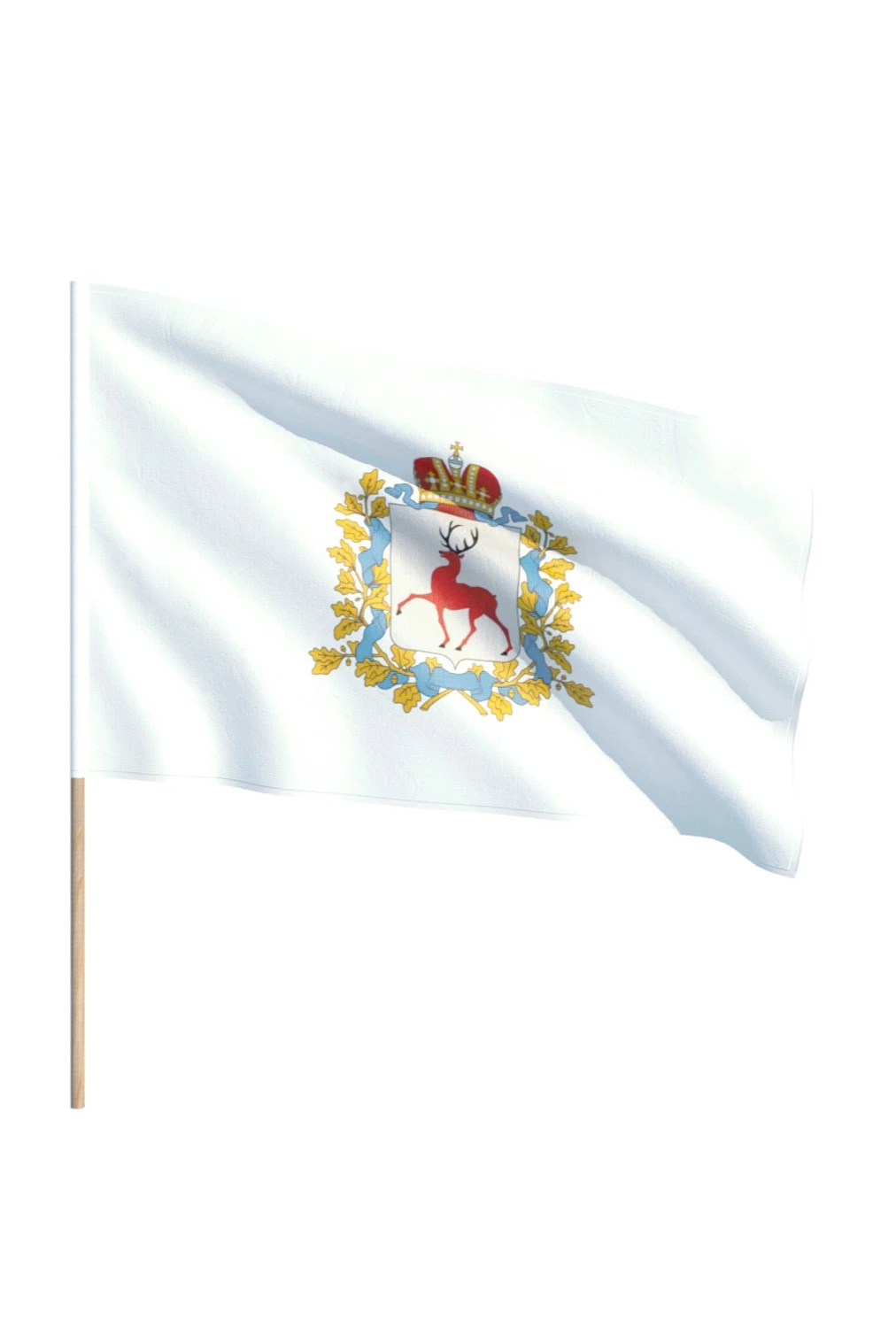 Описание. Флаг Нижегородской области представляет собой прямоугольное полотнище белого шёлка с отношением ширины к длине 2:3 (120см *180см) с двусторонним изображением в его центре полного герба Нижегородской области, установленного законом Нижегородской области от 10 сентября 1996 года № 42-З «О Гербе Нижегородской области», ширина которого составляет две пятых длины полотнища. С трёх сторон, не сопрягаемых с древком флага, полотнище украшено золотой бахромой. Герб представляет собой помещенное на геральдическом щите изображение идущего в серебряном поле червленого оленя, имеющего рога с шестью отростками и черные копыта; геральдический щит увенчан исторической российской короной и обрамлен золотыми дубовыми листьями, соединенными исторической Андреевской лентой.