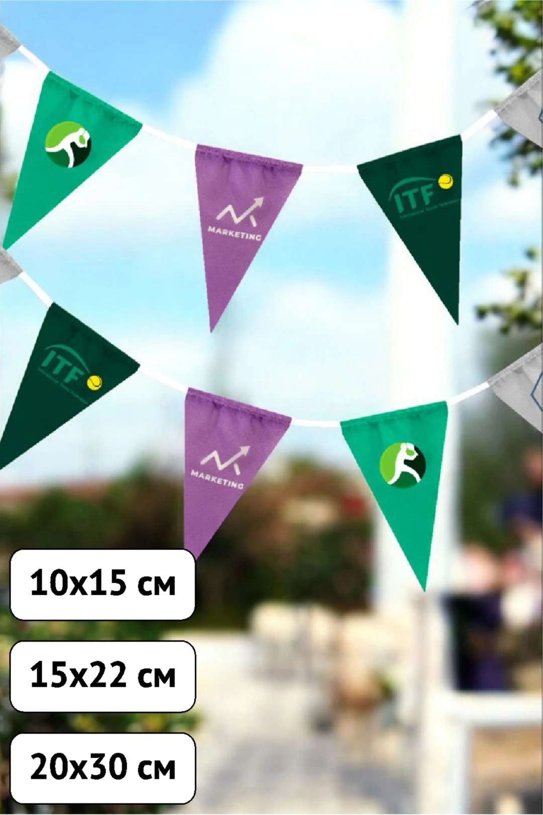 Флажная лента с символикой – это полиэфирный шнур с пришитыми к нему или нанизанными на него фирменными флажками или флажками стран мира, ведомств, субъектов и т.д. Лента с флажками с символикой – это яркий атрибут, который легко можно использовать как на улице, так и в помещении. Если перед вами стоит задача создать атмосферу праздника, выбор в пользу волчатника с символикой будет безошибочным. Лента расцвечивания с флажками с нанесением всегда оснащается свободными концами шнура по 1 метру для привязывания ею к различным неподвижным опорам (столбам, деревьям и т.д.).