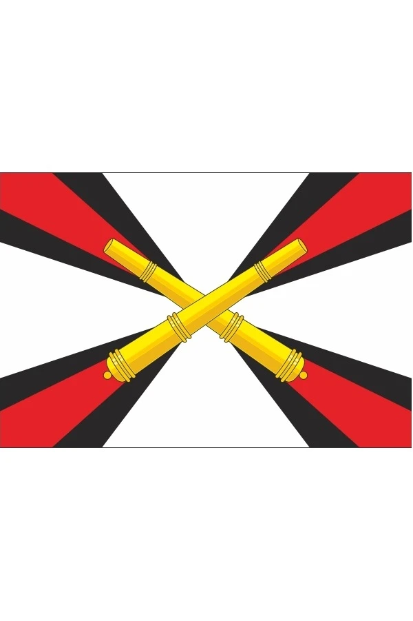 Четырёхконечный белый крест с расширяющимися концами и с равноразделёнными между концами креста чёрно-красно-чёрными лучами. В центре — изображение двух золотых диагонально перекрещённых стволов орудий.