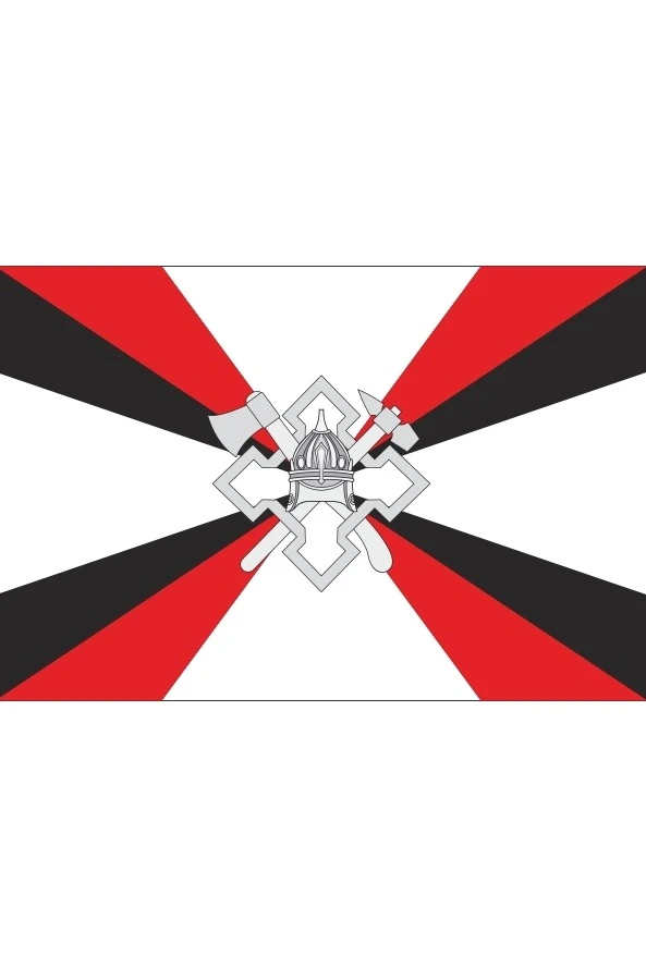 Флаг воинских частей и организаций расквартирования и обустройства войск представляет собой прямоугольное двустороннее полотнище. Рисунок лицевой и оборотной сторон полотнища одинаков и представляет собой четырехконечный крест белого цвета с расширяющимися концами и с равноразделенными между концами креста черно-красными углами. В центре полотнища – изображение серебряных остроконечного шлема в центре четырехбастионной фортеции с продетыми накрест молотком и топором. Отношение ширины флага к его длине 2:3. Отношение ширины изображения к длине флага 1:3.