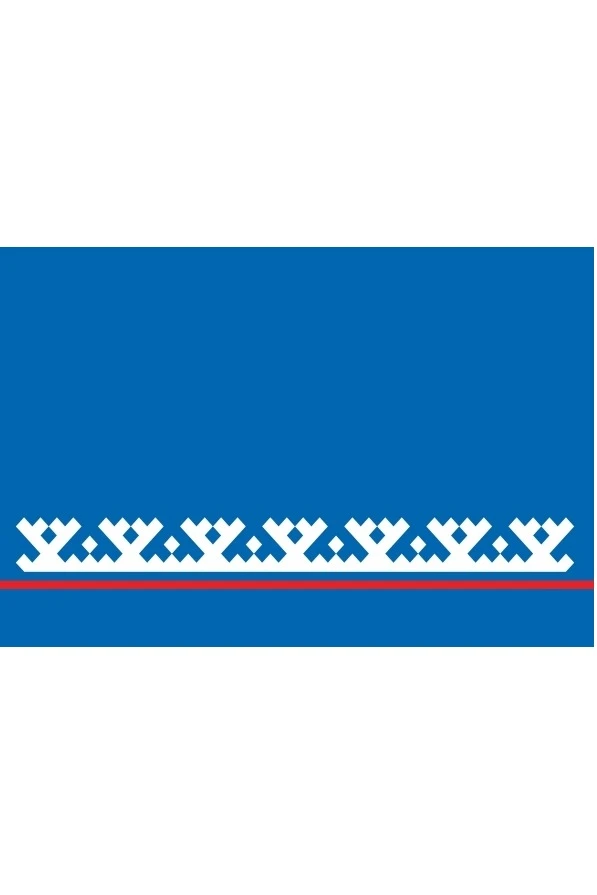 Флаг Ямало-Ненецкого автономного округа представляет собой прямоугольное полотнище яркого сине - голубого цвета. Отношение ширины к длине 2:3. От нижнего края на расстоянии одной седьмой части флага проходит бело - сине - красный горизонтальный рисунок. Общая ширина рисунка - одна пятая часть ширины флага. Отношение ширины белого рисунка, изображенного в виде орнамента геометрически правильных фигур "Оленьи рога", к общей ширине горизонтального рисунка - 4 : 5. Красная и синяя (сине - голубая) полосы одинаковы по ширине и соответствуют размеру (ширине) основания орнамента, то есть каждая равна одной десятой части общей ширины горизонтального рисунка. Площадь единицы элемента, образующего орнамент, имеет ромбовидную форму и составляет 1350 часть всей площади флага. Каждый однообразный участок орнамента состоит из девяти равных ромбов.