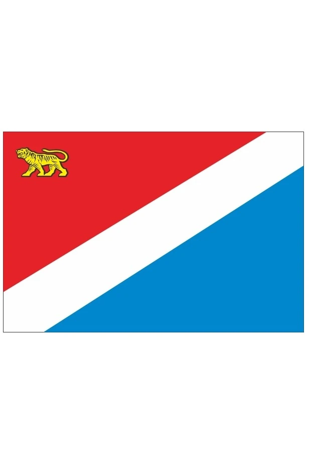 Прямоугольное полотнище, разделенное по диагонали белой полосой и состоящее из двух треугольников: верхнего, располагаемого у древка, красного цвета и нижнего - голубого (лазурного) цвета. В верхнем углу у древка золотое изображение идущего уссурийского тигра. Отношение ширины флага к его длине - 2:3.