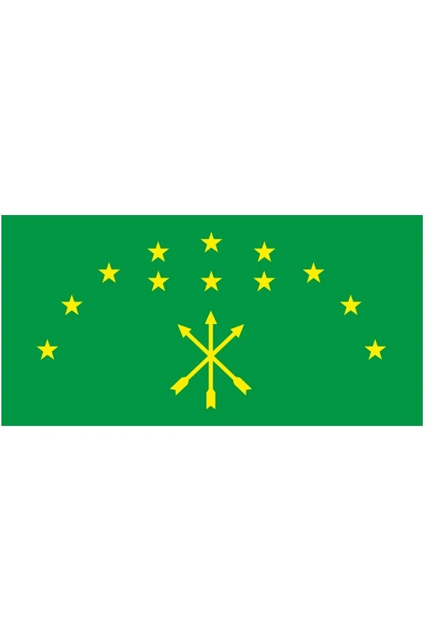 Государственный флаг Республики Адыгея представляет собой прямоугольное полотнище зелёного цвета, на котором изображены двенадцать золотых звёзд и три золотые перекрещённые стрелы, направленные наконечниками вверх. Отношение длины флага к его ширине 2:1.