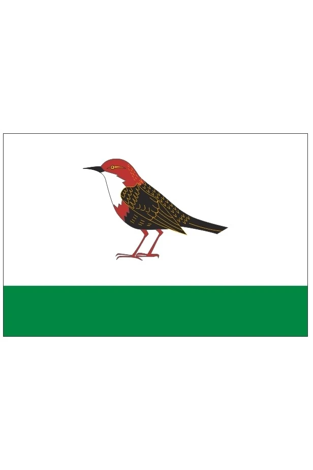 Прямоугольное полотнище с соотношением ширины к длине 2:3, состоящее из двух горизонтальных полос: верхней белого цвета шириной 3/4 ширины полотнища и нижней зелёного цвета; в центре белой полосы чёрный водяной воробей с белой грудью, красными головой, лапами и подгрудным оперением.