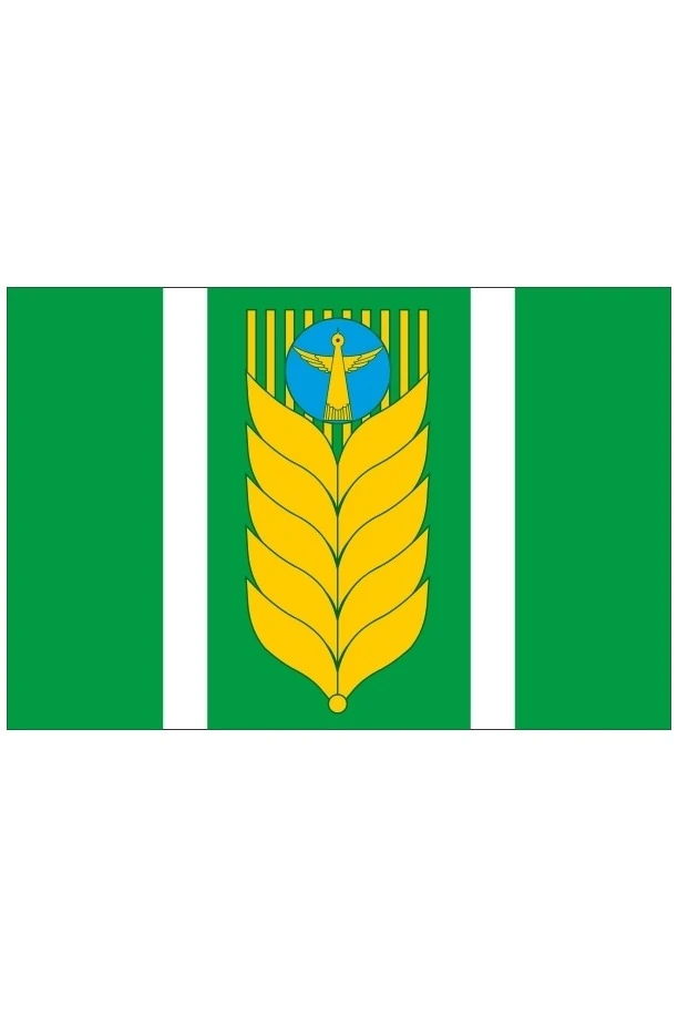 рямоугольное полотнище с соотношением ширины к длине 2:3, состоящее из пяти вертикальных полос зелёного, белого, зелёного, белого и зелёного цвета (ширина крайних зелёных полос по 1/4 длины полотнища, белых полос по 1/10 длины полотнища); в центре средней полосы головка хлебного колоса жёлтого цвета, поверх остьев которой шар синего цвета, обременённый взлетающим жаворонком жёлтого цвета.