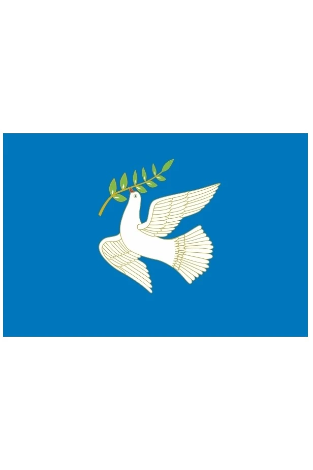 Прямоугольное синее полотнище с соотношением ширины к длине 2:3, в центре которого летящий к древку голубь белого цвета, держащий в клюве жёлтого цвета оливковую ветвь жёлтого цвета с листьями зелёного цвета.