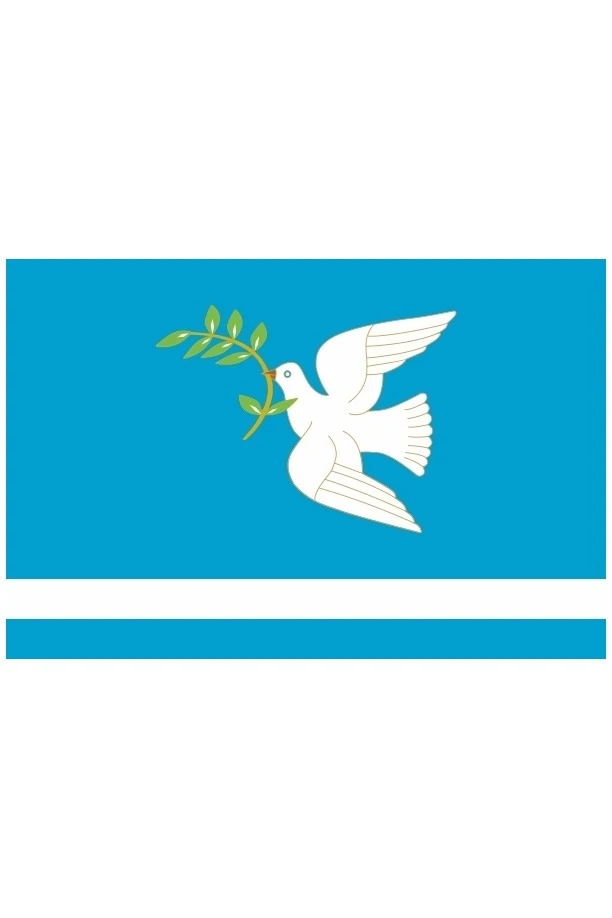 Прямоугольное полотнище голубого цвета с соотношением ширины к длине 2:3, внизу которого горизонтальная полоса белого цвета шириной 1/10 ширины полотнища, отстоящая от нижнего края полотнища на 1/10 ширины полотнища; в середине летящий к древку голубь белого цвета, держащий в красном клюве изогнутую к древку оливковую ветвь жёлтого цвета с листьями зелёного цвета.