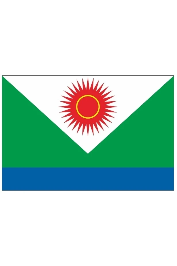 Прямоугольное полотнище с соотношением ширины к длине 2:3, состоящее из двух горизонтальных полос: верхней зелёного цвета шириной 4/5 ширины полотнища и нижней синего цвета; в центре зелёной полосы опрокинутый равнобедренный треугольник белого цвета, основанием которого является верхний край полотнища, а вершина отстоит от нижнего края полотнища на 7/10 ширины полотнища; в центре треугольника красное солнце с прямыми лучами, диск которого окружён жёлтым кольцом.