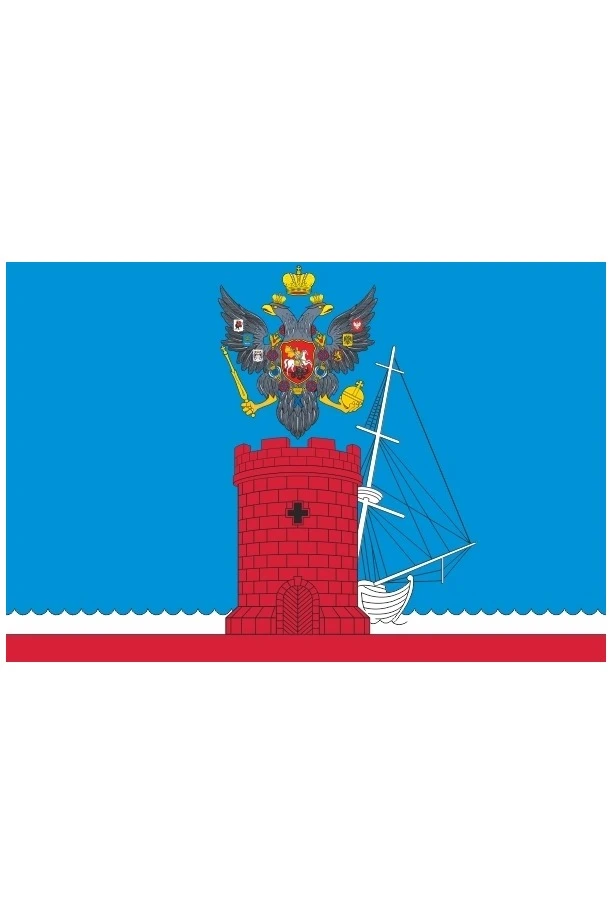 Прямоугольное полотнище с отношением ширины к длине 2:3, состоящее из трёх горизонтальных полос: синего (вверху, шириной 4/6 ширины полотнища), белого (шириной 1/6 ширины полотнища, выщербленной по верхнему краю) и красного цветов, в центре которого вверху - цветной государственный орёл Российской империи (образец "второго типа" 1830-х годов), внизу - стоящая на красной полосе круглая зубчатая башня красного цвета, мурованная чёрным цветом, с закрытыми воротами и - над ними - крестообразным окном чёрного цвета; из-за башни от рдевка возникает на треть (до передней мачты) парусный корабль белого цвета с убранными парусами.