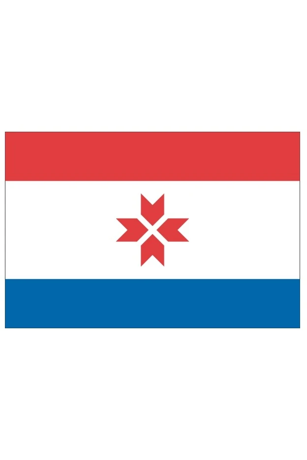 Государственный флаг Республики Мордовия представляет собой прямоугольное полотнище, состоящее из расположенных горизонтально в последовательности сверху вниз трёх полос маренового (тёмно-красного), белого и тёмно-синего цветов.