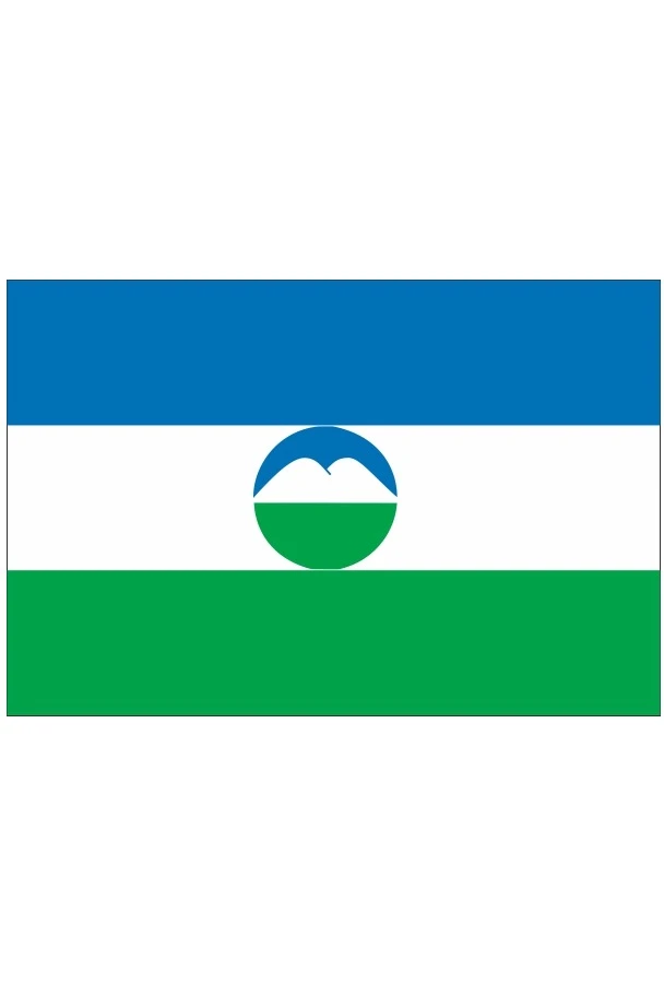 Государственный флаг Кабардино-Балкарской Республики представляет собой полотнище из трёх равновеликих горизонтальных полос: верхней - сине-голубого, средней - белого и нижней - зелёного цвета. В центре полотнища - круг, пересечённый сине-голубым и зелёным полем; на сине-голубом поле - стилизованное изображение горы Эльбрус в белом цвете.