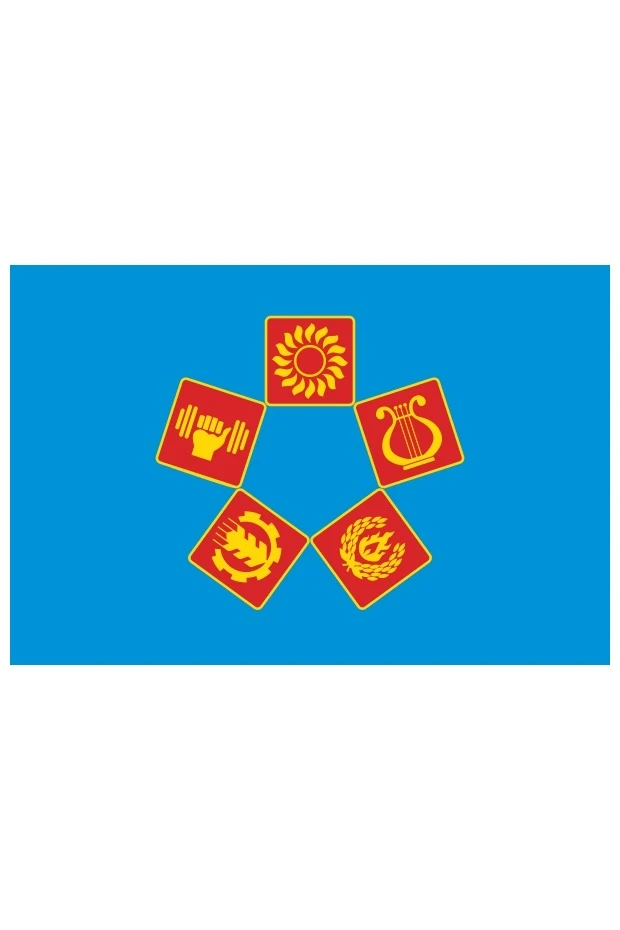 Полотнище с отношением ширины к длине 2:3, на котором червлёный красный пятилепестковый цветок, каждый листок которого - квадрат с закругленными углами, окаймлённый жёлтым. В первом (верхнем) квадрате – жёлтое солнце с 16 волнообразными лучами; во втором квадрате - жёлтая рука, держащая жёлтую гантель; в третьем квадрате - жёлтая лира; в четвёртом квадрате - жёлтый колос, окружённый расторгнутой шестернёй; в пятом квадрате - жёлтое пламя, окружённое расторгнутым жёлтым лавровым венком.
