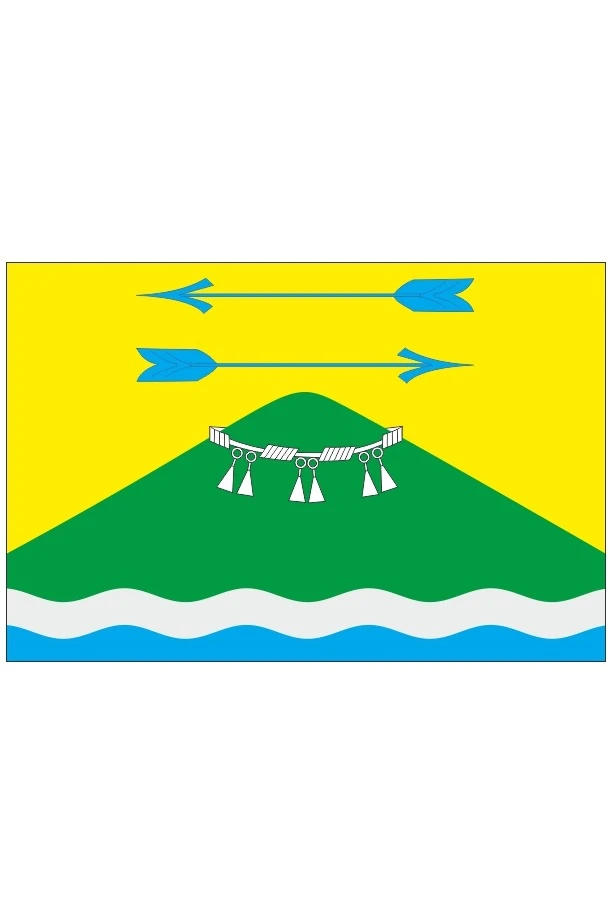 Прямоугольное жёлтое полотнище с отношением длины к ширине 2:3, с изображением фигур из герба поселения: зелёного холма, склоны которого уходят за края полотнища, с белым шейным украшением, вдоль нижнего края холма расположены две волнистые полосы — белая и голубая (каждая в 1/12 ширины полотнища), и над холмом двух голубых стрел.