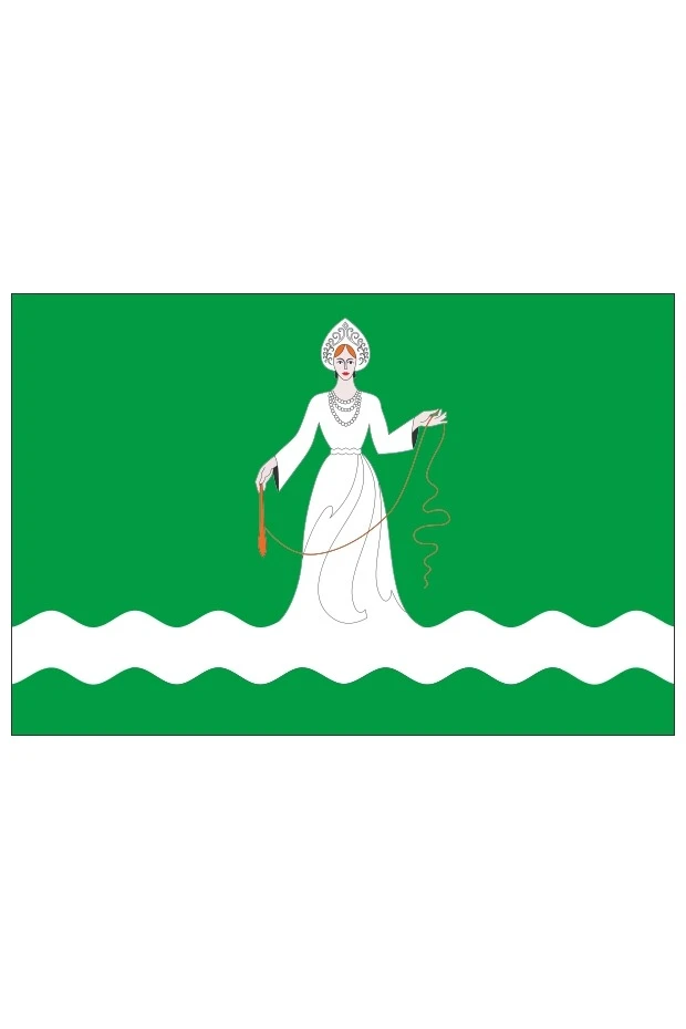 Прямоугольное полотнище с отношением ширины к длине 2:3, зелёного цвета с узкой волнообразной зелёной полосой вдоль нижнего края полотнища, над которой узкая белая волнообразная полоса, из которой — возникающая девушка с жёлтым веретеном в правой руке, а левой рукой — держащая жёлтую нить из веретена. Одежда — белая.