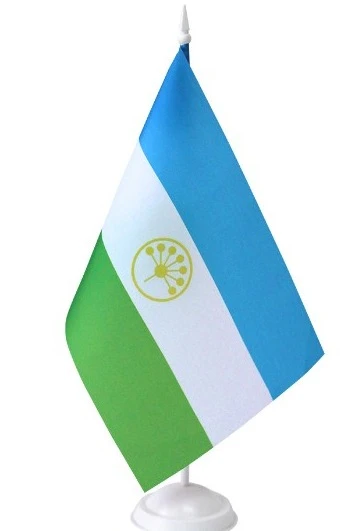 Описание. Государственный флаг Республики Башкортостан представляет собой прямоугольное трёхцветное полотнище с эмблемой, состоящее из горизонтальных равновеликих по ширине полос зелёного, белого, синего цветов (снизу верх) на лицевой и оборотной сторонах. В центре белой полосы золотистым цветом изображена эмблема - круг, в центре которого находится стилизованный цветок курая, состоящий из семи лепестков. В 2003 году пропорция флага с 1:2 была изменена на 2:3.