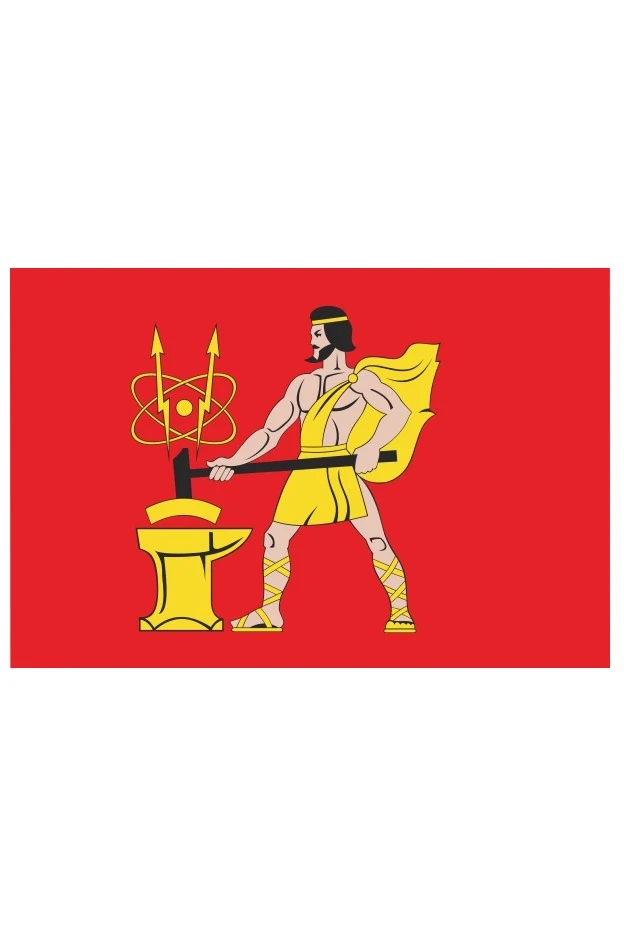 Прямоугольное красное полотнище с изображением Гефеста перед наковальней (фигуры городского герба), сдвинутым от центра к древку. Край одежды Гефеста изображён развивающимся за его спиной в виде декоративного завитка. Соотношение высоты и длины полотнища 2:3, габаритная высота композиции с Гефестом и наковальней составляет 3/4 от высоты полотнища; вертикальная ось наковальни находится на расстоянии от древка, равном 1/3 длины полотнища; расстояние от древка до края композиции с Гефестом и наковальней равно расстоянию от края одежды до свободного края полотнища.