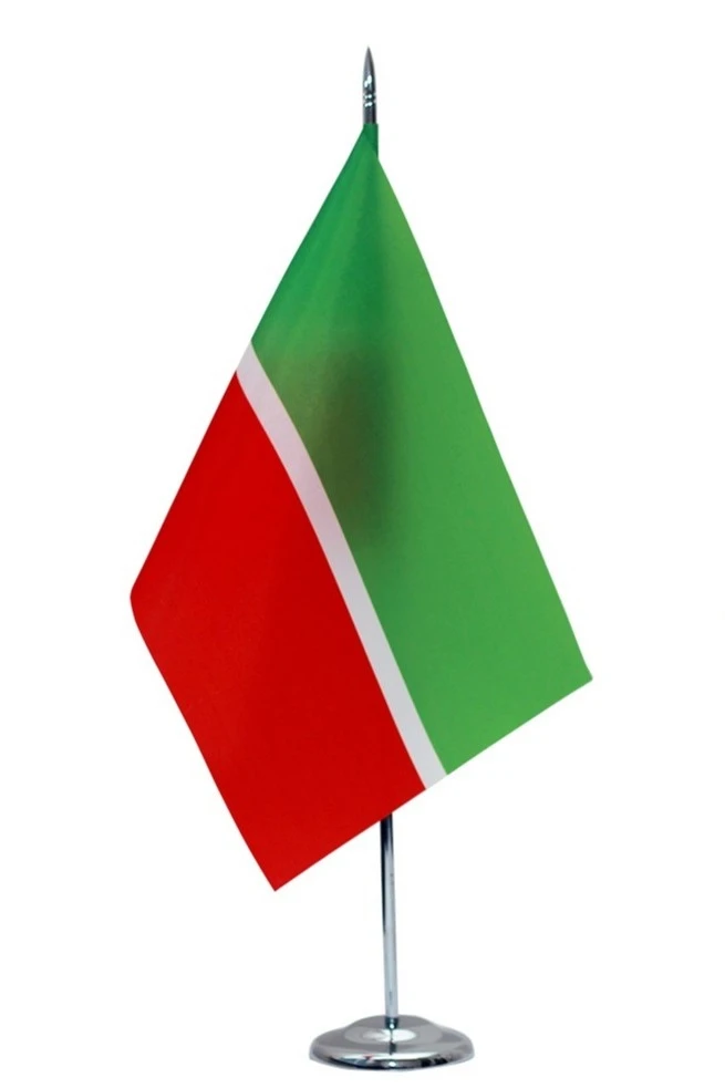 Описание. Государственный флаг Республики Татарстан представляет собой прямоугольное полотнище с горизонтальными полосами зелёного, белого и красного цветов. Официально утверждена пропорция флага - 1:2, однако часто используется искаженный вариант флага с пропорциями 2:3. Такой вариант макета используется в сочетании, к примеру, с флагом России для того, чтобы оба флага имели одинаковый размер. Белая полоса составляет 1/15 ширины флага и расположена между равными по ширине полосами зелёного (кобальт зелёный светлый) и красного (кадмий красный светлый) цветов. Зелёная полоса наверху. Соотношение сторон флага 1:2. Автором флага является народный художник Республики Татарстан, лауреат Государственной премии имени Г. Тукая Тавиль Хазиахметов.