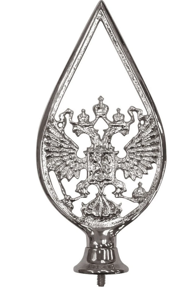 Комплектация, форма, размер. Стандартная форма навершия – капля с гербом РФ (длина - 17,5 см, диаметр у основания - 3,5 см, максимальная ширина - 8,4 см). Навершие имеет у основания шпильку с резьбой М6, с помощью которой навершие крепится к древкам.