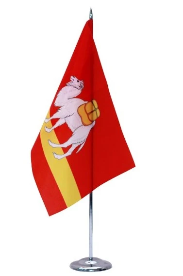 Описание. Флаг области представляет собой прямоугольное полотнище с соотношением сторон 2:3 красного цвета с желтой полосой, составляющей 1/6 ширины полотнища, отвлеченной от нижнего края полотнища на 1/6, и несущее посреди полотнища изображение навьюченного белого двугорбого верблюда с желтой поклажей, составляющего 1/2 ширины полотнища.
