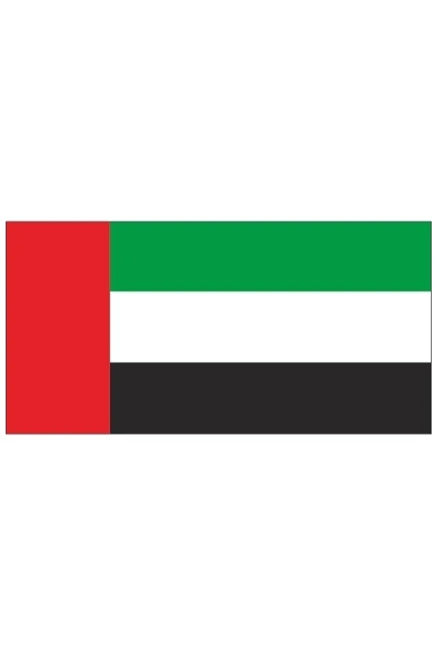 Флаг ОАЭ (Объединенных Арабских Эмиратов) представляет собой прямоугольное полотнище с тремя горизонтальными полосами зеленого, белого, черного (сверху вниз) цветов и красной вертикальной широкой полосой у древка флага. Красная полоса занимает 1/3 часть флага. Красный цвет обозначает мужество. Черная символизирует богатые природные ресурсы страны (в основном нефть). Зеленый цвет - традиционный цвет ислама.
