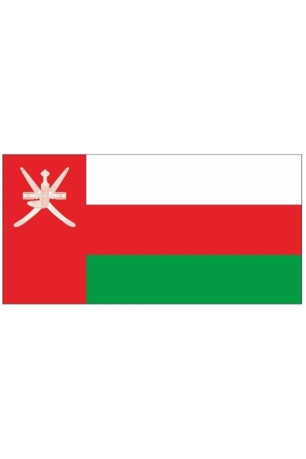 Пропорции сторон государственного флага Омана имеют соотношение 1:2. Представляет собой полотнище, разделенное на три расположенные по горизонтали равновеликие полосы белого, красного и зеленого цветов . В левой части полотнища вдоль основания находится полоса красного цвета. В ее верхней части расположен рисунок белого цвета, изображающий герб султана Омана - два перекрещенных меча и пояс с кинжалом.