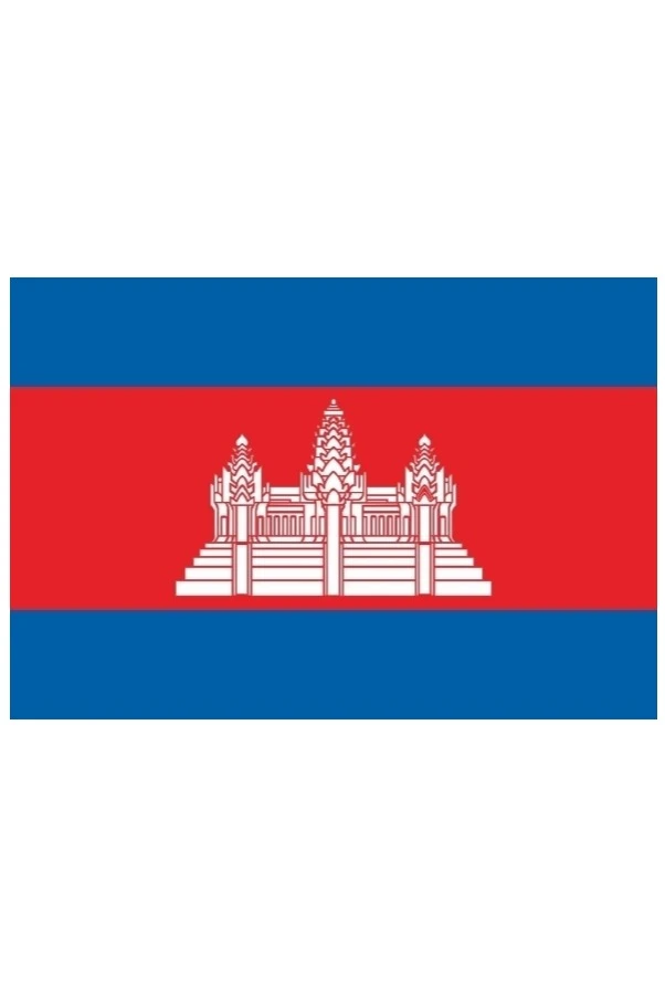 Флаг Камбоджи представляет собой прямоугольное полотнище с тремя горизонтальными полосами синего, красного, синего цветрв. В середине красной полосы расположен Храм Ангкор-Ват, окрашенный в белый цвет. Флаг повторно официально утвержден 30 июня 1993 года. Имеет соотношение сторон 2:3. Синий цвет означает монархическую власть, красный – народ, белый – буддизм.