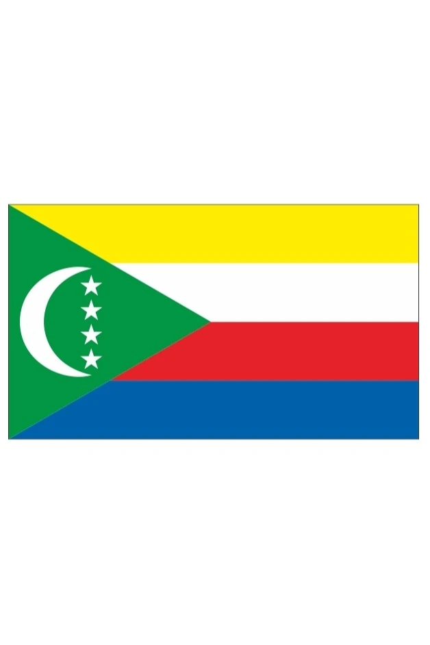 Флаг Коморских островов представляет собой прямоугольное полотнище с четырьмя горизонтальными полосами желтого, белого, красного, синего (сверху вниз) цветов. У древка расположен зеленый треугольник с белым полумесяцем и четырьмя белыми пятиконечными звездами. Флаг был принят 7 января 2002 года. Имеет соотношение сторон 3:5. Зеленый цвет на флаге символизирует ислам.